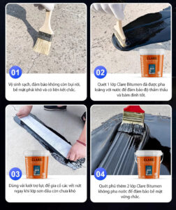 Clare Bitumen Membrain chống thấm cho sàn mái, máng nước, sàn bếp, khu vệ sinh và các kết cấu bê tông, chống thấm cho các loại tàu thuyền và chống ẩm cho tường, sàn tầng trệt.