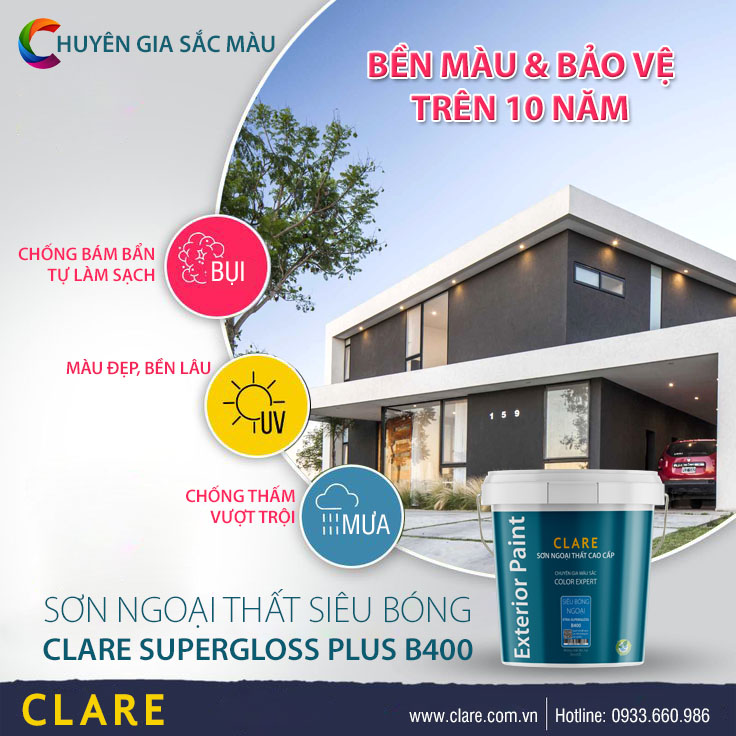 * Sơn phủ 2 lớp sơn ngoại thất siêu bóng thượng hạng Clare XTRA SUPERGLOSS PLUS B400.